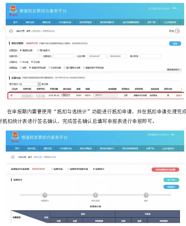 操作步骤如下:通过“首页—抵扣勾选—发票抵扣勾选/发票批量抵扣勾选”路径,按照税款所属期等查询条件查询到相应发票的电子信息,完成勾选、提交、确认等操作。
