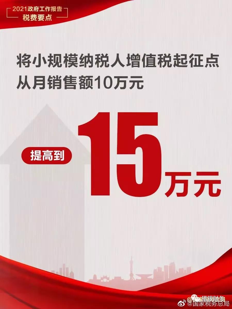 2021年最值得期待的政策就是:将小规模纳税人增值税起征点从月销售额10万元提高到15万元。