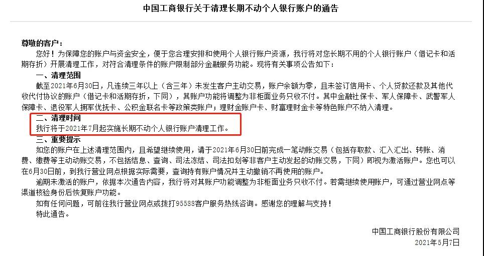 工商银行:2021年7月起对部分个人银行账户开展清理工作,对符合清理条件的账户限制部分金融服务功能!