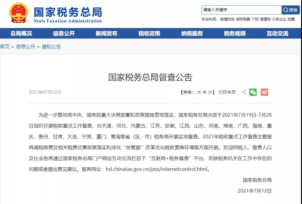 虽然,目前还没有正式的通知,但是前不久,国家税务总局发布了新的督查公告:全国性的税收大督查要开始了,所涉及的省份高达18个。